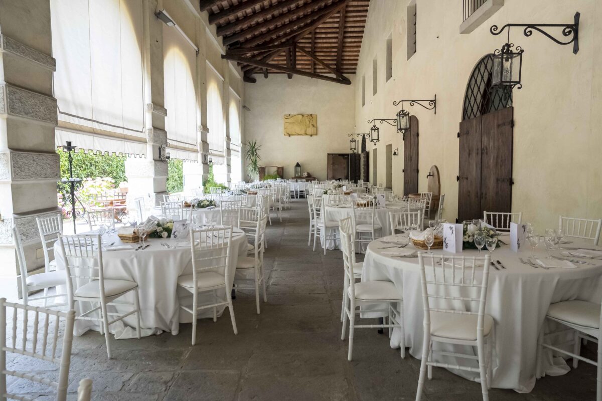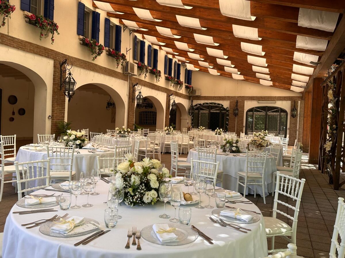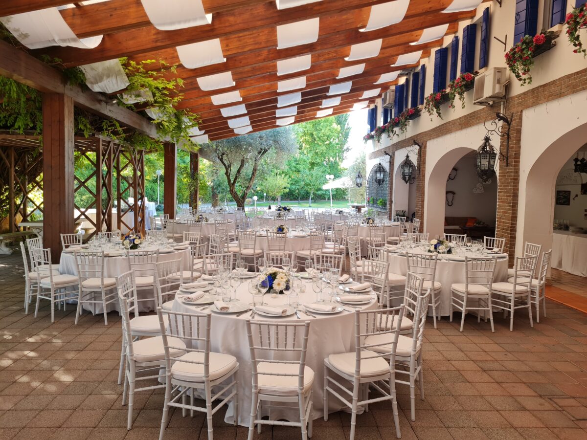 Il porticato esterno: un magnifico porticato dalle travi a vista, capace di accogliere fino a 200 ospiti, è l’ideale per banchetti all’aperto, aperitivi e cerimonie civili, offrendo un riparo elegante con una vista mozzafiato sul parco.