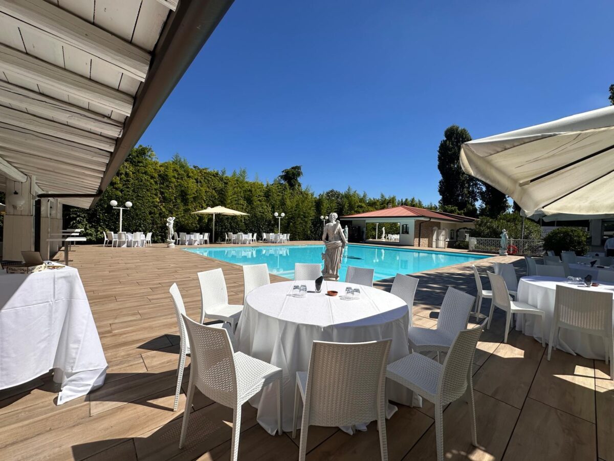 L’area piscina: la splendida piscina, con la sua casetta bar e un porticato coperto, è la cornice ideale per cocktail, aperitivi di benvenuto o per il taglio della torta, regalando un’atmosfera rilassata e chic. A completare il tutto, un grande caminetto esterno per spiedi aggiunge un tocco di calore e tradizione.